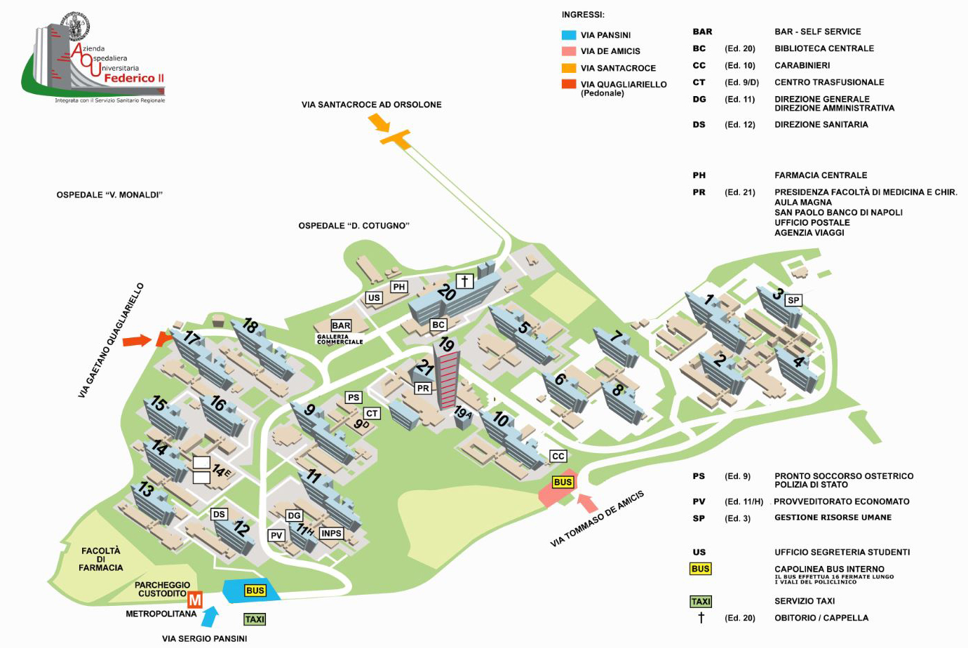 Il Policlinico Universitario Federico II, denominato anche “Nuovo Policlinico” o “Secondo Policlinico”, è situato nella zona collinare di Napoli, la cosiddetta “Zona Ospedaliera”, nelle immediate vicinanze di altre grandi strutture ospedaliere della città: l’Ospedale Cardarelli, l’Ospedale Monaldi, l’Ospedale Cotugno e l’Istituto Nazionale per lo Studio e la Cura dei Tumori “Fondazione G. Pascale”.